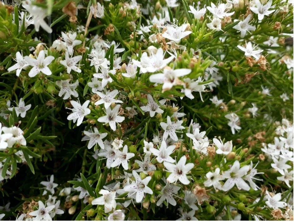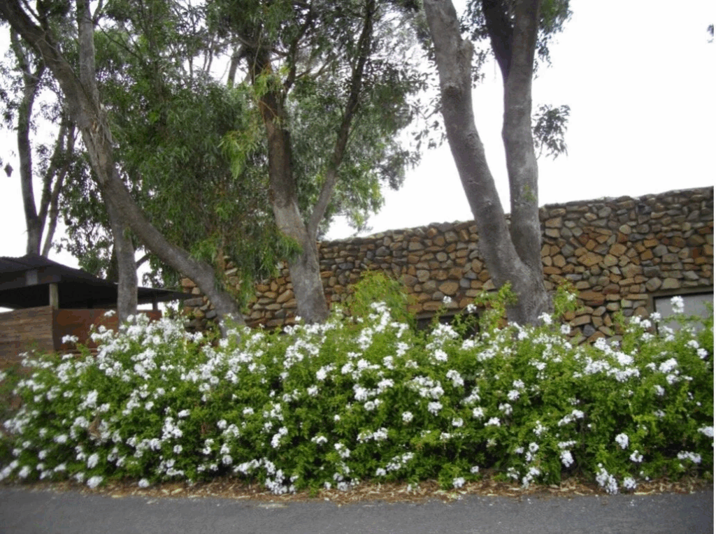 Creeping Boobialla. This native ground cover has got it all! It’s fast growing, low maintenance, fire retardant and drought hardy AND helps to control weeds. Evergreen and a tough little plant, it loves full sun and will trail down an embankment. There is both a broad leaf and a fine leaf version which can look good mixed in together and it also comes in purple, should you need a break from the white.